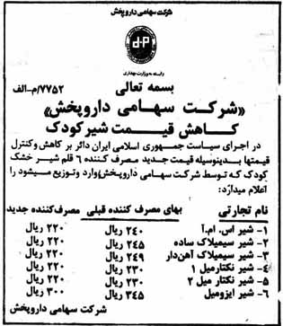 آگهی قیمت شیر خشک در میانه دهه 60 و اوج نایابی شیر خشک به دلیل اعمال تحریم ها