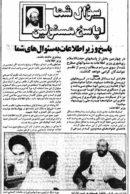 29 خرداد ماه در روزنامه جمهوری اسلامی، مطلب جالبی منتشر شده است، در شرایط سخت جنگ، آیت الله ری شهری، وزیر اطلاعات وقت، به عنوان بلند پایه ترین مسئول امنیتی در کشور، به پرسش خوانندگان پاسخ می دهد.