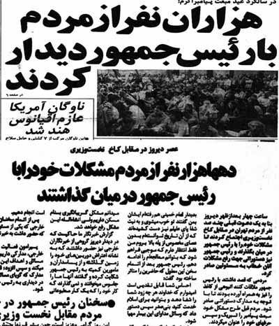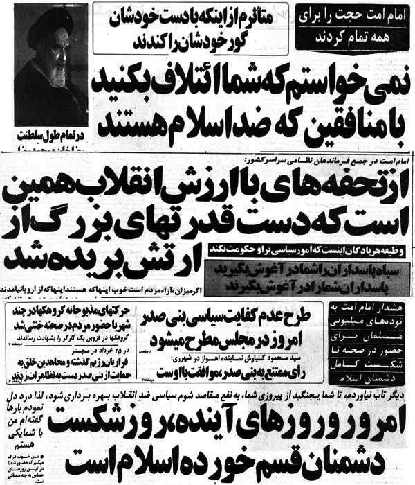 درد دل امام با مردم: بارها گفته ام، من با شما هستمدر همین روز سخنرانی حضرت امام(ره) و اتمام حجت با حامیان رئیس جمهور وقت، مردم تظاهراتی خودجوش را با حدود دو میلیون نفر در تهران، علیه بني صدر برگزار می کنند، رئیس مجلس وقت، آیت الله هاشمی در سخنانی با مردم اعلام همبستگی و می گوید: «طرح عدم کفایت رئیس جمهور دلیل هماهنگی مجلس با شماست»
