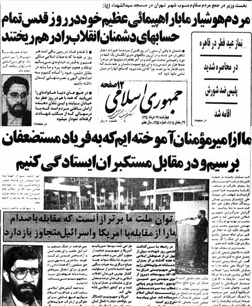 در این ایام، راهپیمایی روز جهانی قدس نیز با شکوه هرچه تمام تر برگزار می شود، در این راهپیمایی که طبق روال در جمعه آخر ماه مبارک رمضان برگزار می شود، آیت الله هاشمی خطیب نماز جمعه است، وی نیز مانند سایر مسئولین صلح با عراق را مردود دانسته و تنها راه پایان جنگ را تنبیه متجاوز می داند.