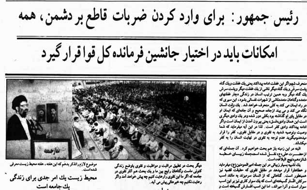 ابتدای هفته چهارم خردادماه سال 67، تیتر اصلی اغلب مطبوعات دفاع جانانه و همه جانب رئیس جمهور، آیت الله خامنه ای از فرماندهی جنگ آیت الله هاشمی است.