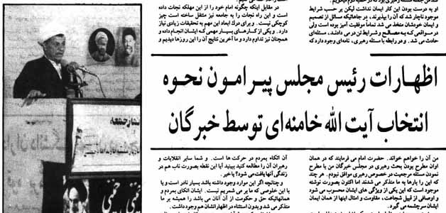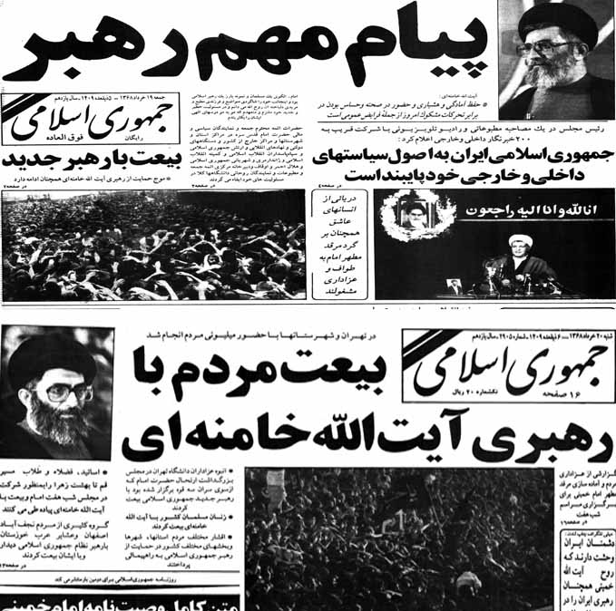 *هفته چهارم خرداد 1368:درخواست حاج احمد آقا برای رسیدگی به اموال حضرت امام/ هاشمی از آخرین لحظات امام می گوید: یادم هست با حضور آقایان موسوی اردبیلی، موسوی نخست وزیر و مقام محترم رهبری به آنجا رسیده بودیم/فقط یک لحظه ایشان چشمشان را باز کردند و به آسمان نگاه کردند و بعد چیزی نبود که ما بتوانیم روی آن حساب کنیمدر نیمه خرداد سال 1368، ایران سیاه پوش شد. عروج ملکوتی حضرت امام(ره) همه جامعه را شوکه کرده است، هنوز مردم عزادار هستند که مجلس خبرگان رهبری به سرعت تشکیل جلسه می دهد و رهبری آینده انقلاب را انتخاب می کند. حضرت آیت الله خامنه ای به عنوان رهبری نظام برگزیده می شوند و مطبوعات هفته چهارم خردادماه سال 1368، اختصاص به انعکاس اخبار دسته های عزادار مردم از اقشار مختلف برای بیعت با رهبری جدید نظام دارد. از دانش آموزان گرفته تا نظامیان به دیدار آیت الله خامنه ای می آیند تا با ایشان بیعت کنند.