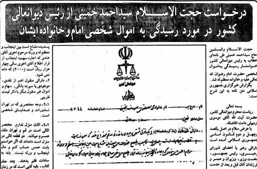 27 خردادماه، حاج سید احمدآقای خمینی، یادگار امام عزیز، در نامه ای از رئیس دیوانعالی کشور میخواهد تا به اموال شخصی امام و خانواده ایشان بنا بر اصل 142 قانون اساسی رسیدگی شود. در این نامه، ایشان به ارثیه مادی حضرت امام(ره) اشاره می کند.