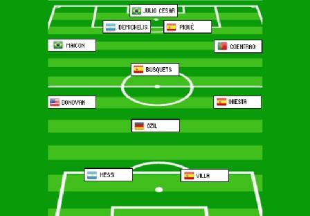 بوسكتس در ميانه ميدان بازي مي‌كند، دونوان از آمريكا و اينيستا از اسپانيا در جناحين خط مياني حضور دارند.
