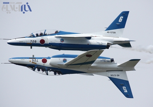 در این تصویر خلبانان ژاپنی را در مانور می بینید که بطرز ماهرانه ای دو جت جنگنده کاوازاکی تی چهار را از شکم به هم چسبانده اند. سرعت این دو هواپیما متعلق به اسکادران فرشتگان آبی و پرندگان تندر هنگام اجرای مانور بیش از 1000 کیلومتر است.