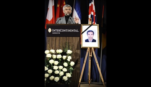 تصویر شهید دکتر شهریاری در نشست خبری جلیلی - ژنو