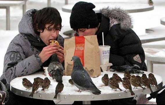 زود قضاوت نکنید. از کجا معلوم که اینها گرسنه تر از پرندگان نباشند؟ از کجا معلوم که قبلا سهم پرنگان را نداده اند؟ باز هم زود قضاوت نکنید،من قصد دفاع از این دو نفر را ندارم و فقط می گویم با یک عکس نمی توان قضاوت کرد زیرا اطلاعات ما برای قضاوت،کافی نیست.