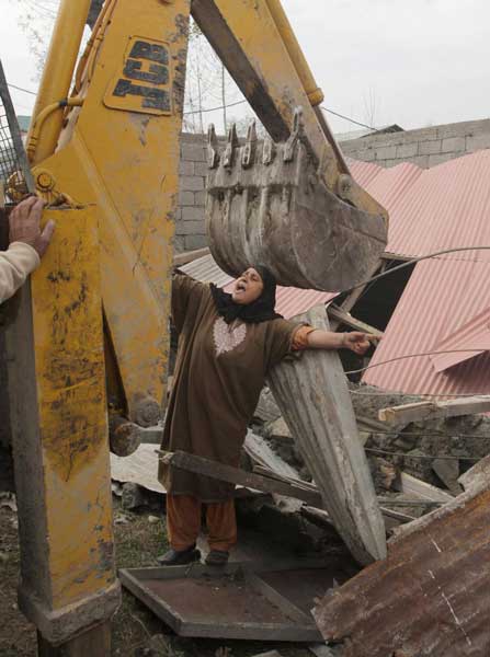 مقاومت یک زن اهل سرینگر کشمیر در برابر عملیات بولدوزرها برای تخریب خانه غیر قانونی اش