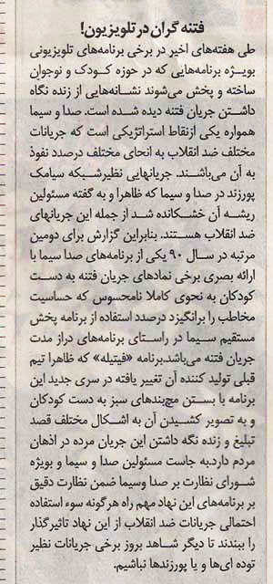 این نشریه مدعی شد سری جدید برنامه فتیله در صدد استفاده از برنامه پخش زنده در راستای برنامه های بلندمدت جریان فتنه است و با بستن مچ بند سبز به دست كودكان قصد تبلیغ و زنده نگه داشتن جریان سبز در اذهان مردم دارد.