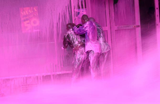 پليس اوگاندا در حال پاشيدن رنگ به روي رهبر مخالفان دولت در تظاهرات اعتراضي به افزايش قيمت غذا و سوخت در شهر كامپالا