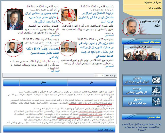 عصرايران - تصوير زير ، عكس متحركي از صفحه اول سايت وزارت كار و امور اجتماعي است كه تقريباً همه اخبار و كل عكس هاي آن مربوط مي شود به آقاي عبدالرضا شيخ الاسلامی ،وزير كار و امور اجتماعي ؛ گو اين كه در آن وزارتخانه غير از آقاي وزير نه كسي حرفي مي زند ، نه كاري انجام مي دهد و نه ... راستي اين سايت وزارت كار دولت جمهوري اسلامي ايران است يا وبلاگ شخصي فردي به نام عبدالرضا شيخ الاسلامی؟!