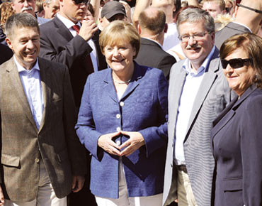 خانم آنگلا مرکل صدراعظم آلمان به همراه همسرش "يواخيم زاور" در هنگام ورود به کشور لهستان.