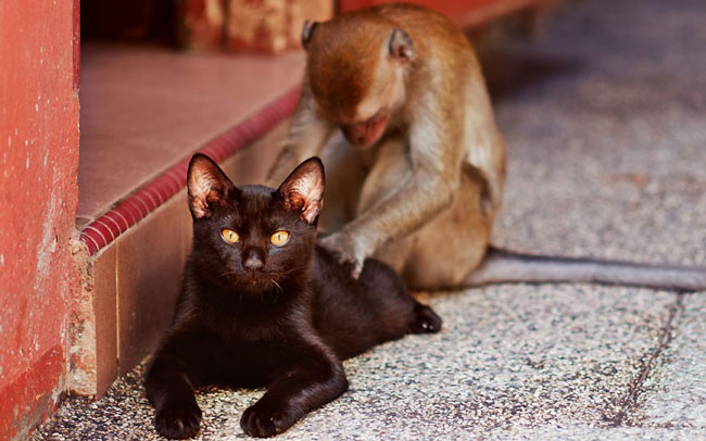 یک میمون در حال ماساژ دادن یک گربه سیاه (کوالالامپور)