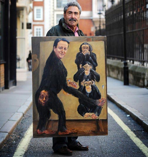 یک هنرمند انگلیسی تابلویی به نشانه اعتراض علیه دیوید کامرون نخست وزیر انگلیس در مقابل دادگاه رسیدگی به ماجرای رسوایی