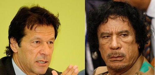 عمران خان، رهبر حزب تحریک انصاف پاکستان، در حال سخنرانی برای معترضان. چهره این شخصیت سیاسی بی شباهت به دیکتاتور لیبی نیست.