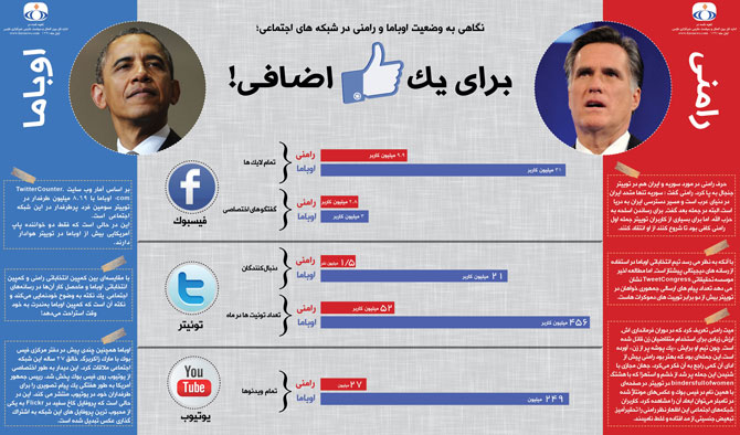 بر اساس نتایج نظرسنجیهای اخیر که در روزهای باقیمانده به ششم نوامبر تقریبا هر روز منتشر میشود «بارک اوباما» از حزب دموکرات و «میت رامنی» از حزب جمهوریخواه اختلاف اندکی دارند اما مسئلهای که نباید از نظر دور نگاه داشت ایفای نقش شبکههای نوظهور اجتماعی مانند فیس بوک، توئیتر و یوتیوب و تلاش کاندیداهای ریاست جمهوری آمریکا و طرفداران آنها برای جلب نظر رای دهندگان به وسیله این ابزارهای ارتباطی نوین است.