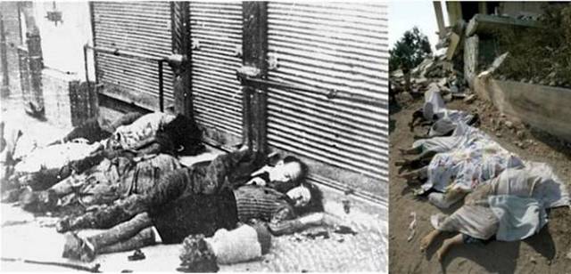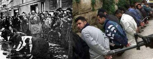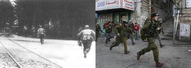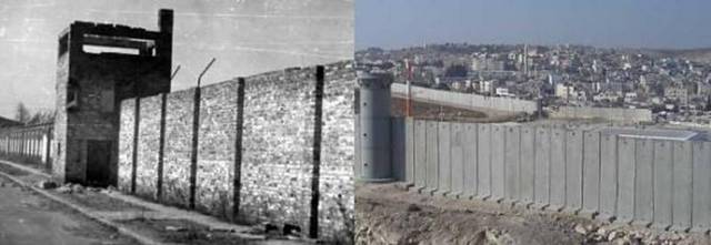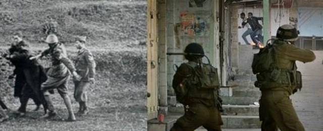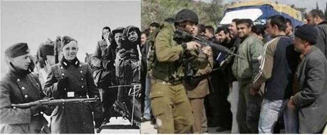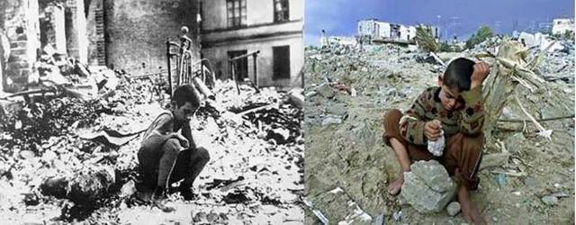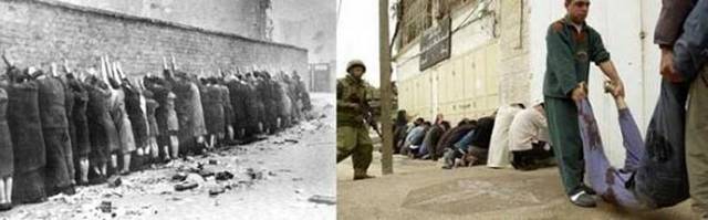 عکس های سیاه و سفید سمت چپ ، عکس هایی هستند که یهودیان در دنیا منتشر کردند تا همه بدانند که هیتلر و نظامیانش با آنها چه کردند اما آنها الان صهیونیست ها همان جنایت ها را با فلسطینیان انجام می دهند.