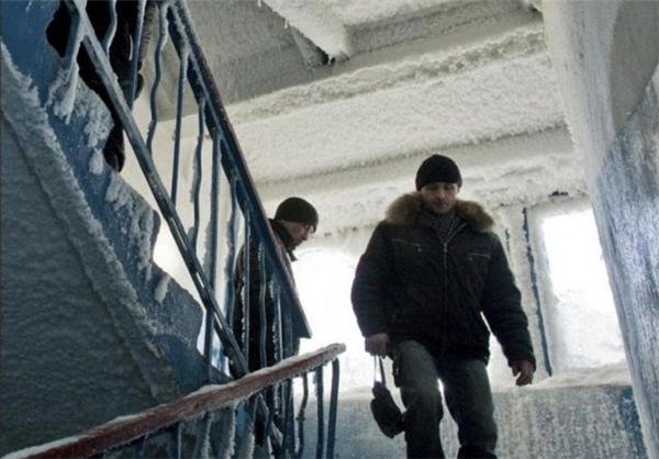 آنچه در زیر میبینید تصویری از راهروی یک مجتمع مسکونی در کاراگاندای قزاقستان است که در آن سردی هوا به منفی 59 درجه سانتیگراد رسیده است و در داخل ساختمان هم قندیلهای یخ بر دیوارها تشکیل شده است.