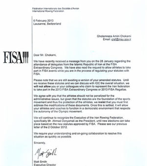 لطفا توجه داشته باشید که ما هنوز در انتظار دریافت اساسنامه اصلاح شده شما هستیم. تا زمانی که این اساسنامهها را دریافت نکردهایم تا بر اساس آن بتوانیم با IOC مشورت کنیم، به شما یا همکارانتان که نماینده فدراسیون ایران هستند، اجازه شرکت در مجمع فوقالعاده سال 2013 FISA را نخواهیم داد.
