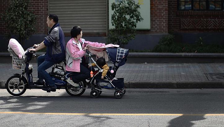 اين زوج چيني تلاش مي کنند کالسکه فرزند خود را با موتور ببرند.
