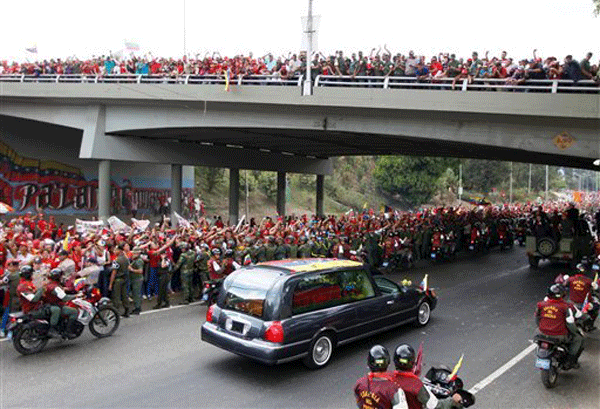 روز گذشته دهها هزار نفر از حامیان چاوز در مسیر حمل تابوت وی به سمت "موزه نظامی 4 فوریه" شهر کاراکاس حاضر شدند و ایوو مورالس رییس جمهوری بولیوی نیز سوار بر خودرویی که " نیکولاس مادورو" معاون چاوز و نامزد انتخابات آینده آن را می راند، در مراسم حاضر شد.