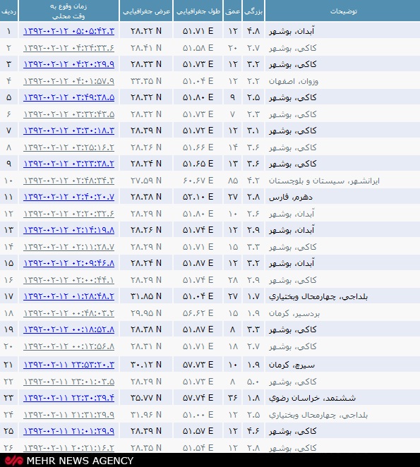 زمینلرزههای آبدان در شهرستان دیر دارای شدتهای 4.8 - 2.6 - 2.9 و 3.2 بود.