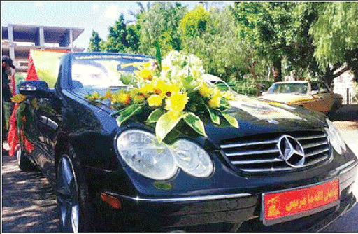 عصر ایران - خودروی بنز متعلق به حزب الله لبنان که برای تشییع جنازه شهدای این مجموعه استفاده می شود. بر روی پلاک این خودرو، در کنار آرم حزب الله لبنان نوشته شده است: "در امان خدا ای داماد". (منبع: سایت لبنانی صوت الجبل)