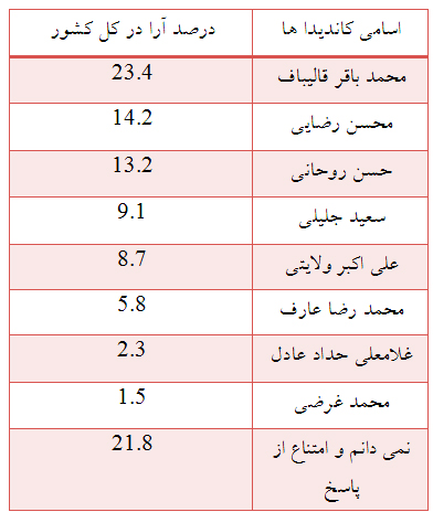 فرارو- این نظرسنجی در تاریخ نوزدهم خرداد ماه توسط یکی از نهاد های معتبر، در کل کشور صورت گرفته است.