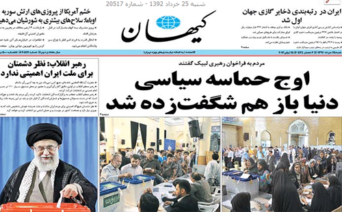 روزنامه کیهان در شماره روز شنبه 25 خرداد "اوج حماسه سیاسی دنیا باز هم شگفت زده شد" را انتخاب کرده است.