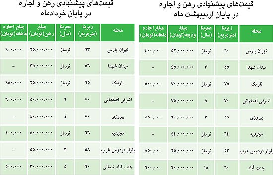 واحدی ۵۵ متری در میدان شهدا که در روزهای پایانی اردیبهشت ماه، به مبلغ ۴۵ میلیون تومان رهن داده می‌شد؛ در دو روز پایانی خردادماه واحدی ۵۶ متری در همان محله با قیمت ۳۵ میلیون تومان از سوی مالک برای رهن پیشنهاد شده است.
