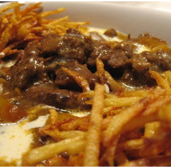 سیب زمینی و هویج را به صورت خلالی می بریم. سیب زمینی را در روغن سرخ می کنیم و هویچ ها را در آب می پزیم. گوشت را در ظرف می ریزیم و با سیب زمینی و هویج آن را تزئین می کنیم.