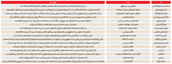 برخی بر این باورند که احمدینژاد هر چند خود را وابسته حزب و گروهی نمیداند اما به زودی فعالیت حزبی را آغاز خواهد کرد، راهاندازی بنیاد بهار این گمانه را تقویت میکند اما احمدینژاد که از شهرداری تهران به پاستور رفت مدتهاست یک آرزو در سر میپروراند «مدیریت جهان.» باید دید او با استفاده از سفرهایی که رفت و شهرتی که به دست آورد چه خواهد کرد و مشایی چه نقشی را در آینده سیاسی احمدینژاد ایفا میکند. او خود چه خواهد کرد و زندهباد بهار چه سرنوشتی خواهد داشت. فعالان سیاسی در مورد آینده سیاسی احمدینژاد اظهارنظرهای مختلفی دارند جدول ذیل بخشی از این اظهارات است.