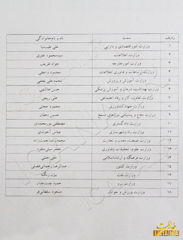 به گزارش خبرگزاری خانه ملت حجتالاسلام دکتر حسن روحانی روز گذشته و پس از ادای سوگند و سخنرانی خود در مراسم تحلیف اسامی اعضای کابینه را دو هفته زودتر به رئیس مجلس شورای اسلامی ارائه کرد.