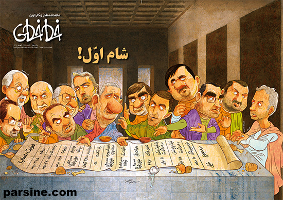 پارسینه - کارتون روی جلد چاپ شهریوماه ماهنامه طنز «خط خطی»، با ایده گرفتن از دیوارنگاره معروف «شام آخر» لئوناردو داوینچی، کابینه رئیسجمهور حسن روحانی را به تصویر کشیده که برای «شام اول» خود مجبور است تا صورتحساب دولت قبلی را قورت دهد و هضم دهد.