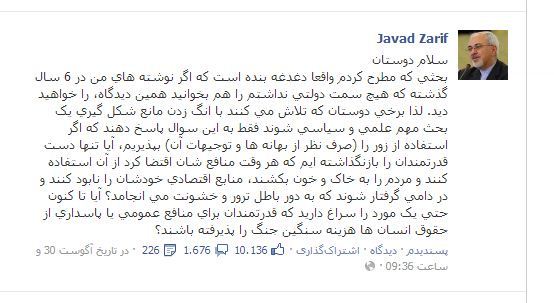نوشته جدید ظریف در فیس بوک تا لحظه انتشار این خبر از سوی 10 هزار و 136 نفر لایک شده یا مورد تایید قرار گرفته است.