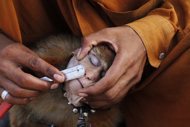 صاحب یک میمون دست آموز در لاهور پاکستان در حال تراشیدن موهای صورت میمون قبل از نمایش خیابانی