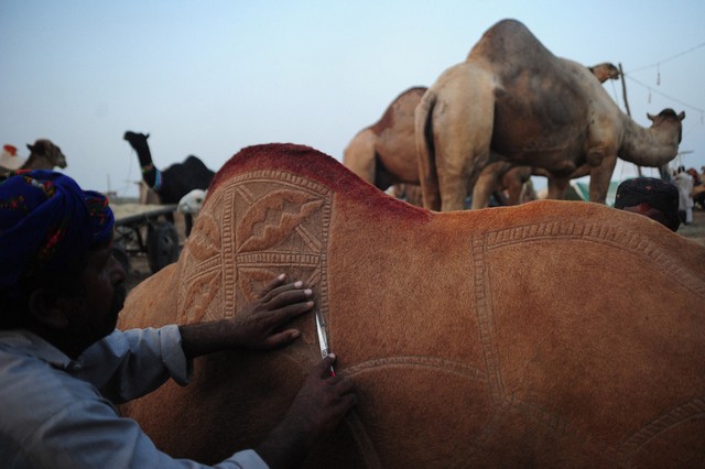 تزیین شترها برای فروش در بازار عید قربان در کراچی پاکستان