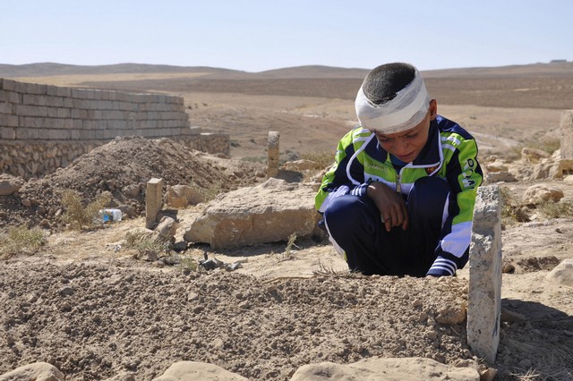 نوجوان عراقی بر سر قبر پدرش که در اثر انفجار تروریستی کشته شده است