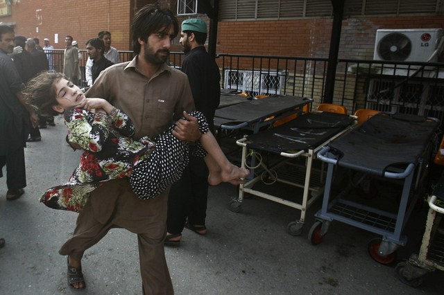 انتقال یک نوجوان مجروح از انفجار ترویستی در پیشاور پاکستان به بیمارستان