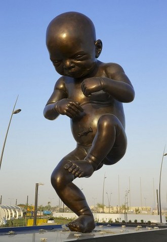 نصب یک مجسمه برنزی از نوزاد انسان در مقابل یک مرکز بهداشتی و درمانی در دوحه
