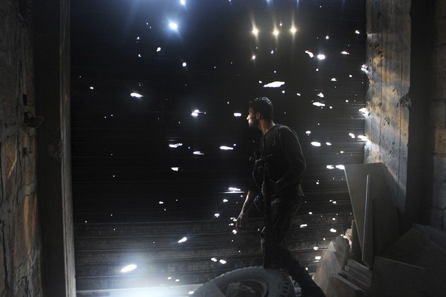 یک شورشی مسلح در شهر حلب سوریه داخل یک مغازه بسته در این شهر