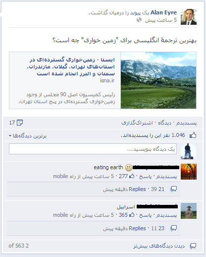 آلن ایر خبری در مورد زمین خواری در ایران را به اشتراک گذاشته و پرسیده است: «بهترین ترجمه انگلیسی برای زمین خواری چه است؟»