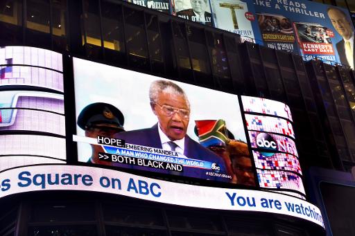 مانیتور بزرگ در میدان تایمز در نیویورک در حال پخش خبر مرگ ماندلا