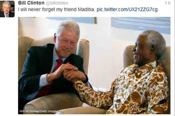 نوشته بیل کلینتون رئیس جمهور پیشین آمریکا در توئیتر: "من هرگز دوستم مادیبا را فراموش نمی کنم"