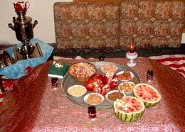 ماهیدودی و سپس هندوانه، انار، انواع تنقلات از جمله کشمش، گردو، تخمه،