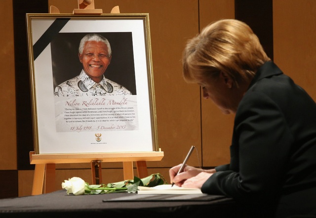 امضای دفتر یادبود ماندلا از سوی آنگلا مرکل صدر اعظم آلمان در سفارت آفریقای جنوبی در برلین