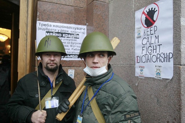 معترضان دولت اوکراین در حال نگهبانی از یک ساختمان اشغال شده دولتی در شهر کی یف
