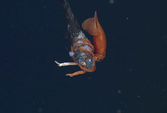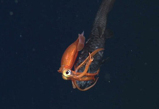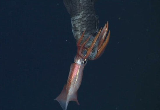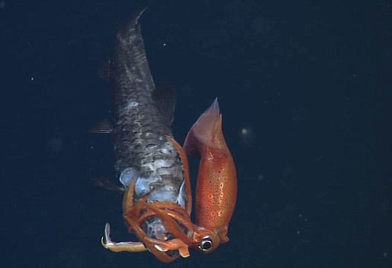 ماهی مرکب قرمز در نبردی یک ساعته ماهی بزرگتر را به اعماق آب‌ها می‌کشاند.