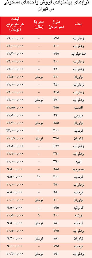 یک واحد مسکونی به متراژ 200 متر و 100 متر تراس و 2 پارکینگ به همراه 34 متر انباری در خیابان زعفرانیه 2 میلیارد و 400 میلیون تومان (12 میلیون تومان قیمت هر متر مربع) قیمتگذاری شده است. از سوی دیگر متری 12 میلیون تومان قیمت هر متر مربع واحدی 200 متری با 3 مستر و سالن ورزش و شنای فعال در فرعی درجه یک زعفرانیه، تعیین شده است.