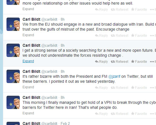 کارل بیلدت وزیر خارجه سوئد که برای دیدار رسمی از ایران در تهران به سر می برد در صفحه توییتر خود گزارش های سفر خود به تهران و اصفهان را منتشر می کند.
